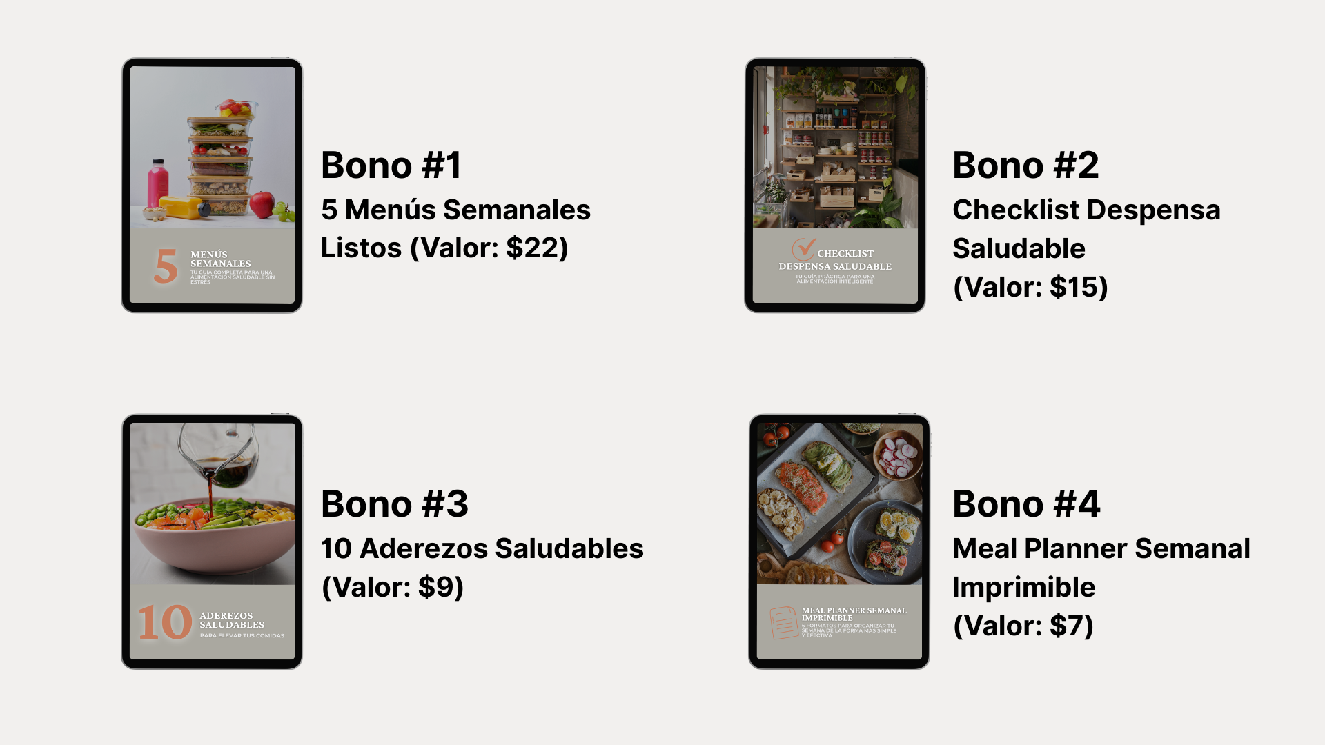 Porque quiero que tengas TODO lo necesario para transformar tu cocina, también he decidido incluir estos 4 bonos súper valiosos: